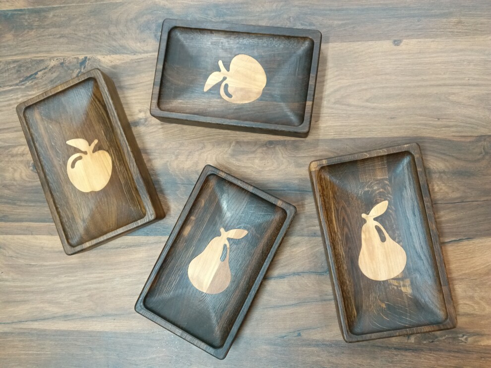 Блюдо - менажница имеет вставки из светлой древесины в виде яблока. Менажница позволяет красиво сервировать фрукты, орешки, сыр, закуски и т.д.