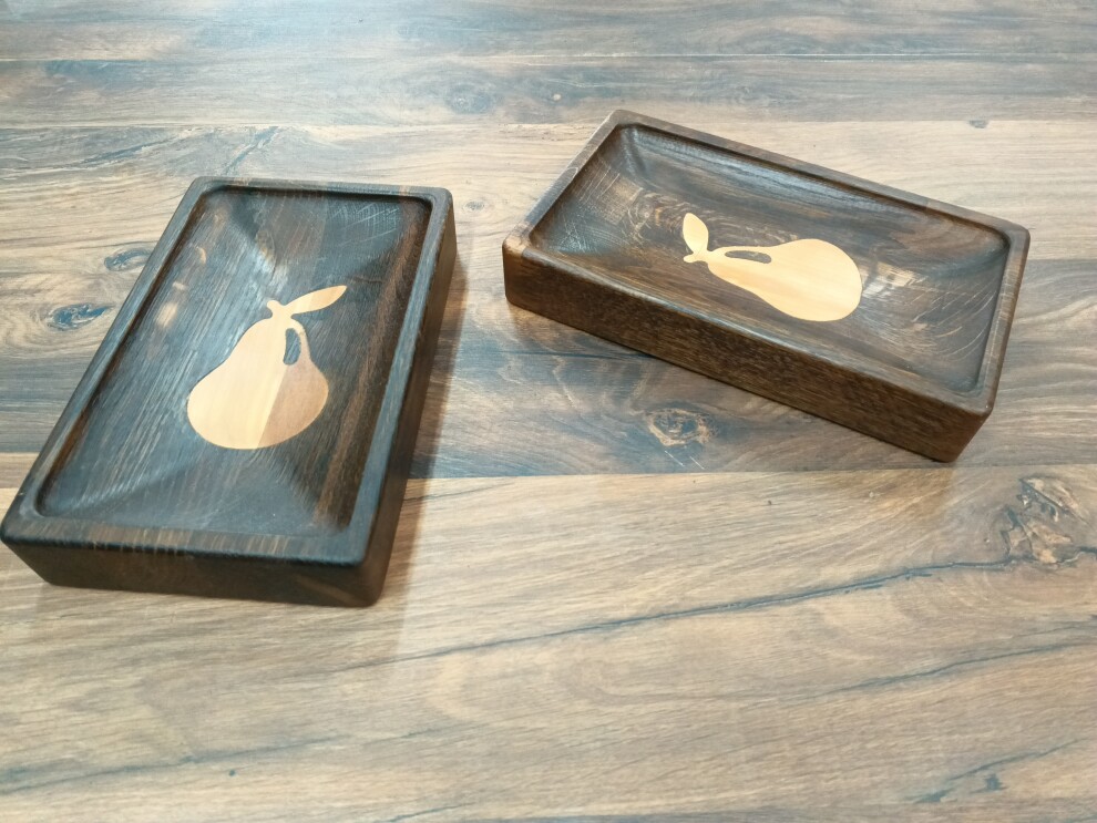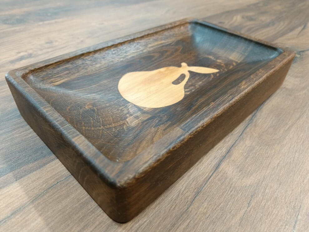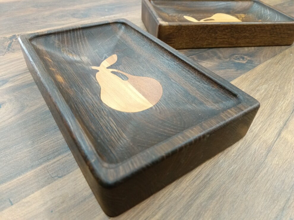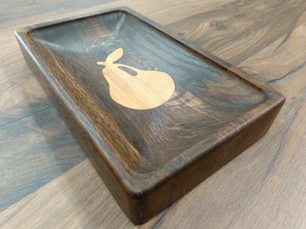 Блюдо - менажница имеет вставки из светлой древесины в виде груши. Менажница позволяет красиво сервировать фрукты, орешки, сыр, закуски и т.д.