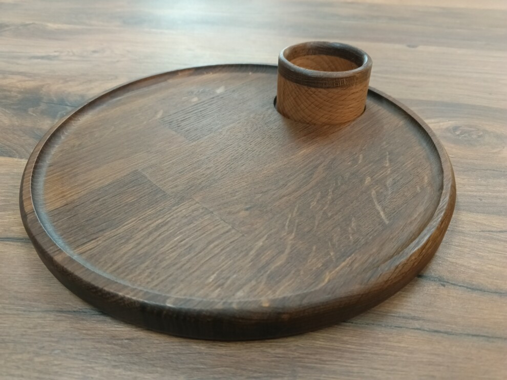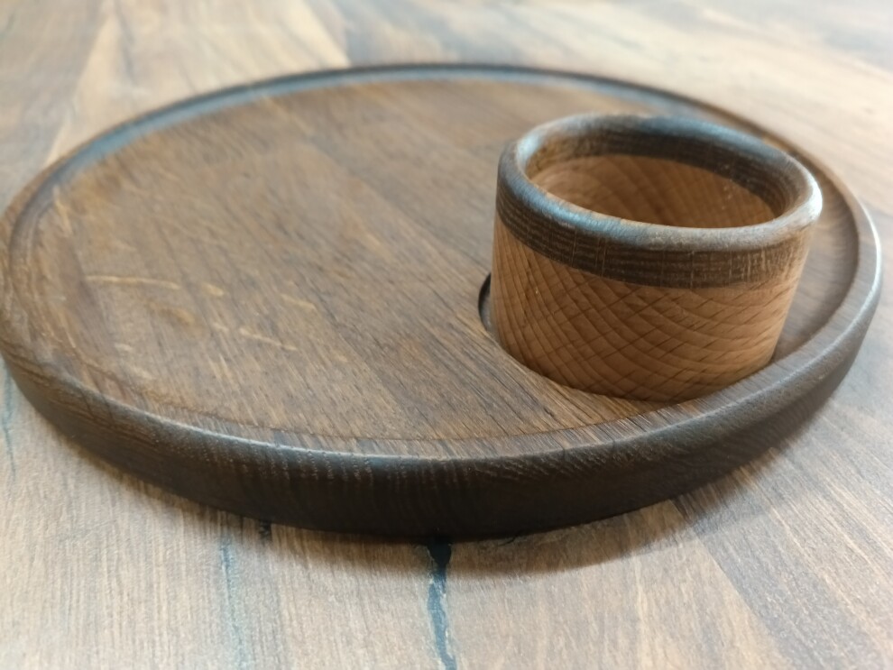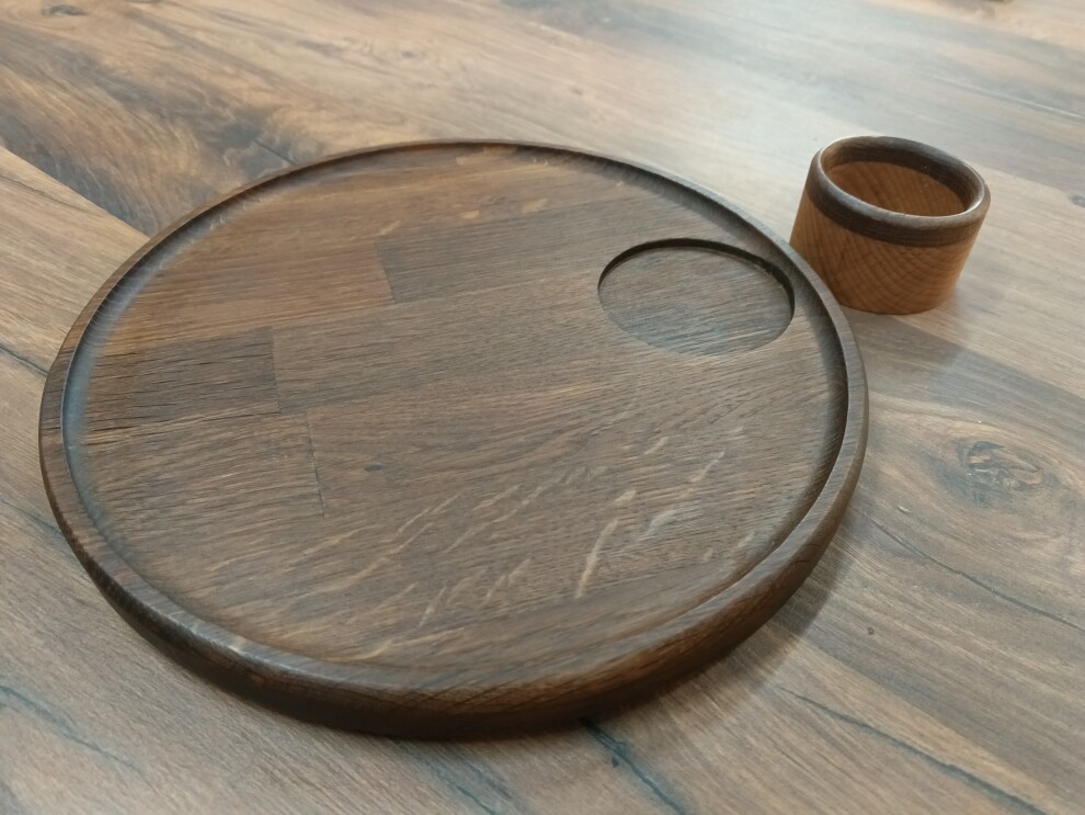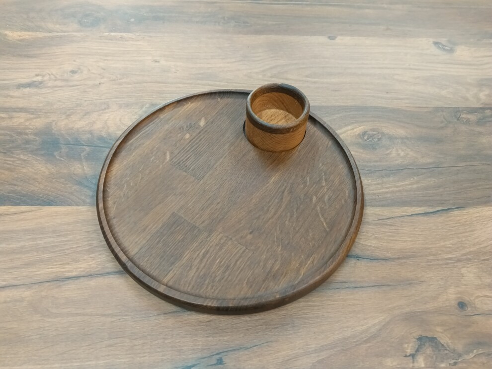 Красивый и прочный круглый поднос из благородного дуба с низкими бортами и специальным местом для соусника станет незаменимым атрибутом для стильной подачи блюд в вашем доме. Его универсальный дизайн подходит для кухни, домашних чаепитий, выездов на природу и праздников в компании.