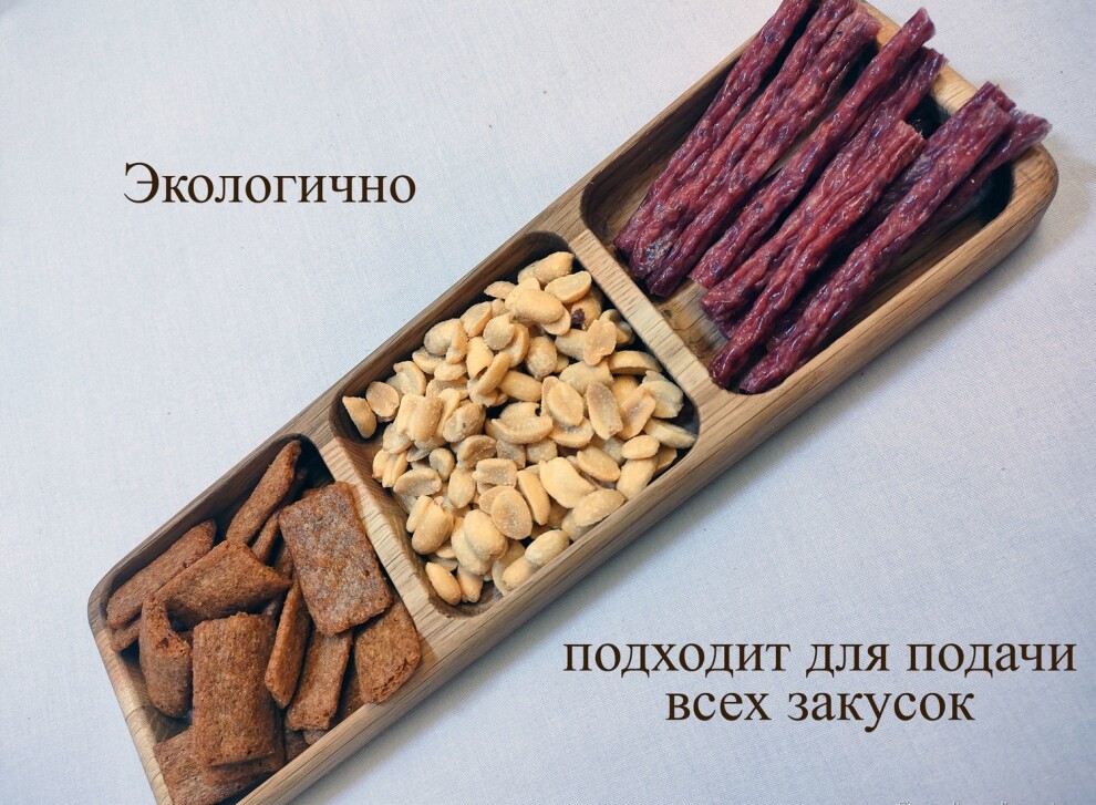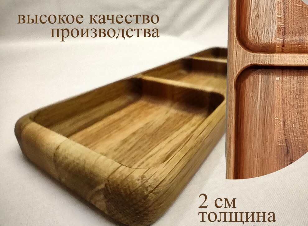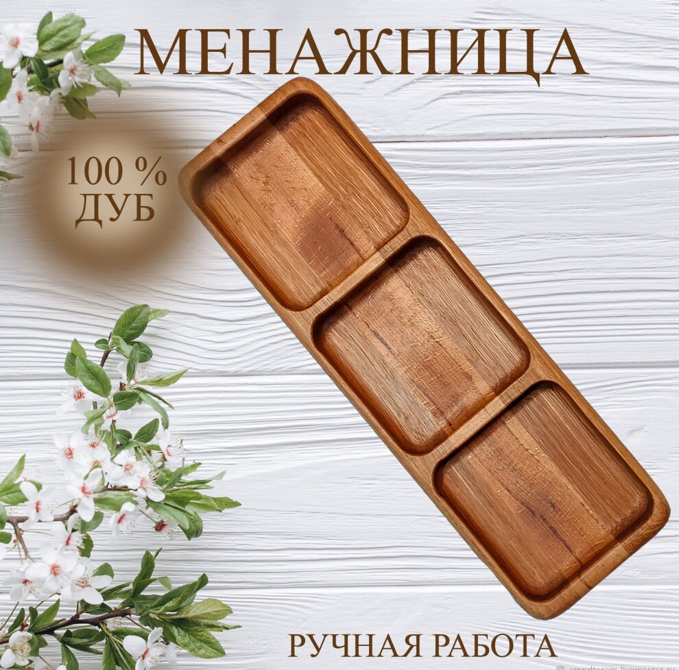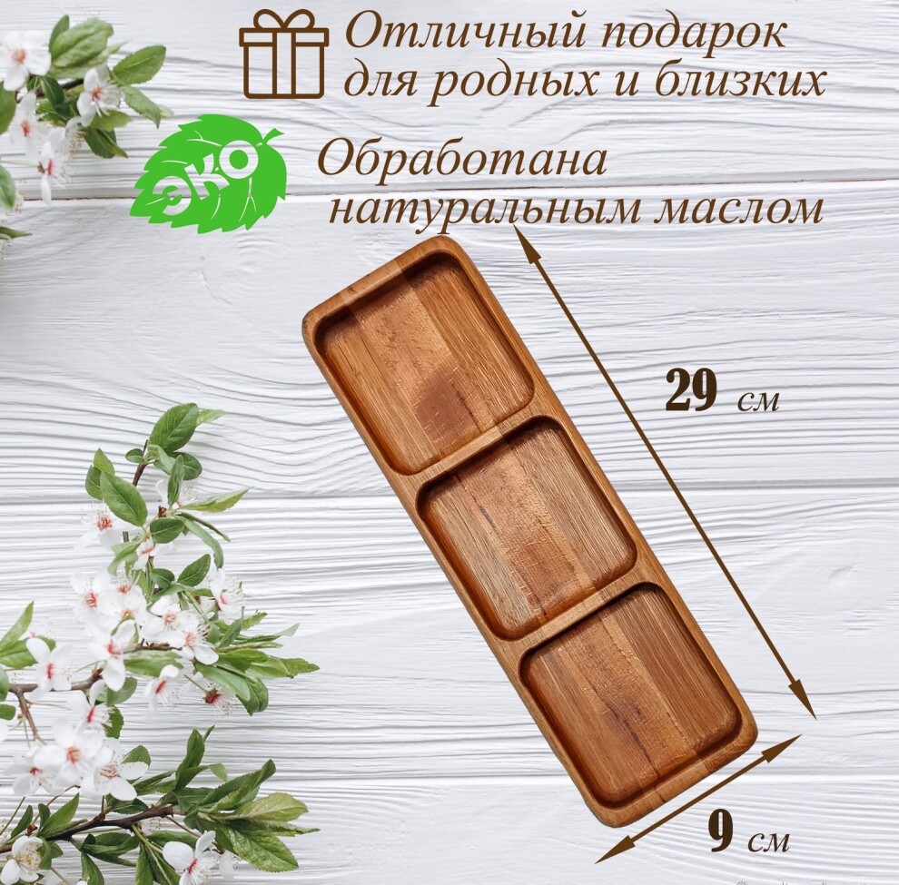 Менажница из натурального дуба с тремя глубокими секциями (29 х 9 см, толщина 2 см) — универсальная деревянная посуда для стильной подачи фруктов, овощей, орехов, сыра и десертов.