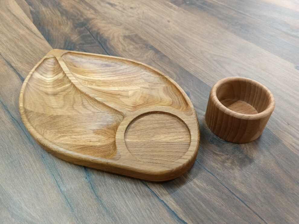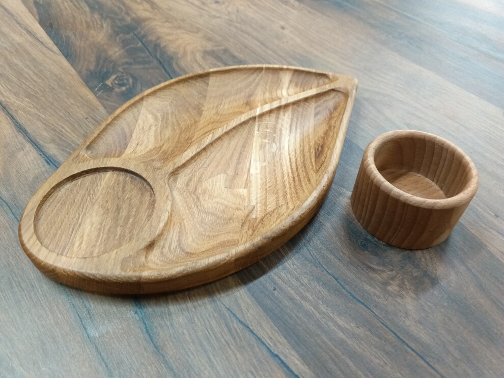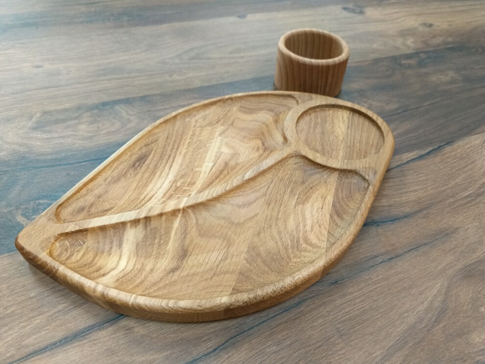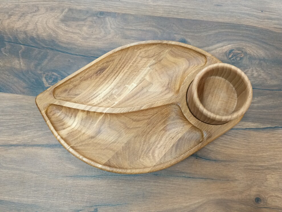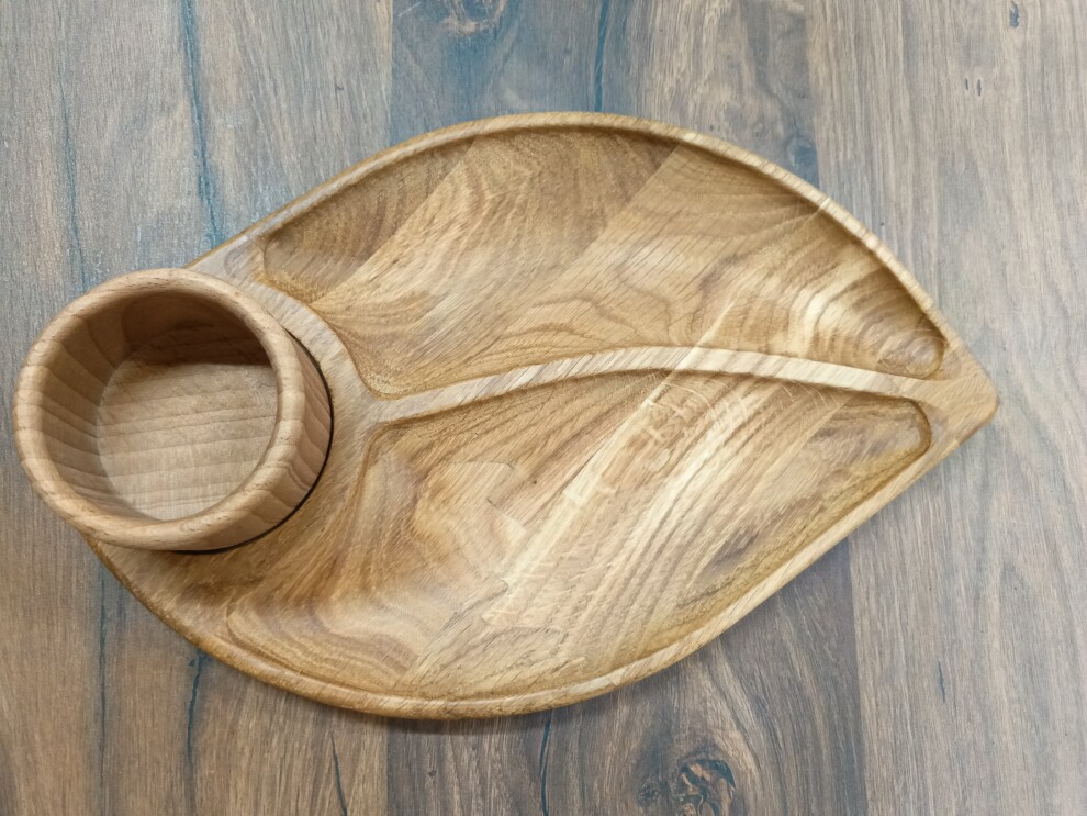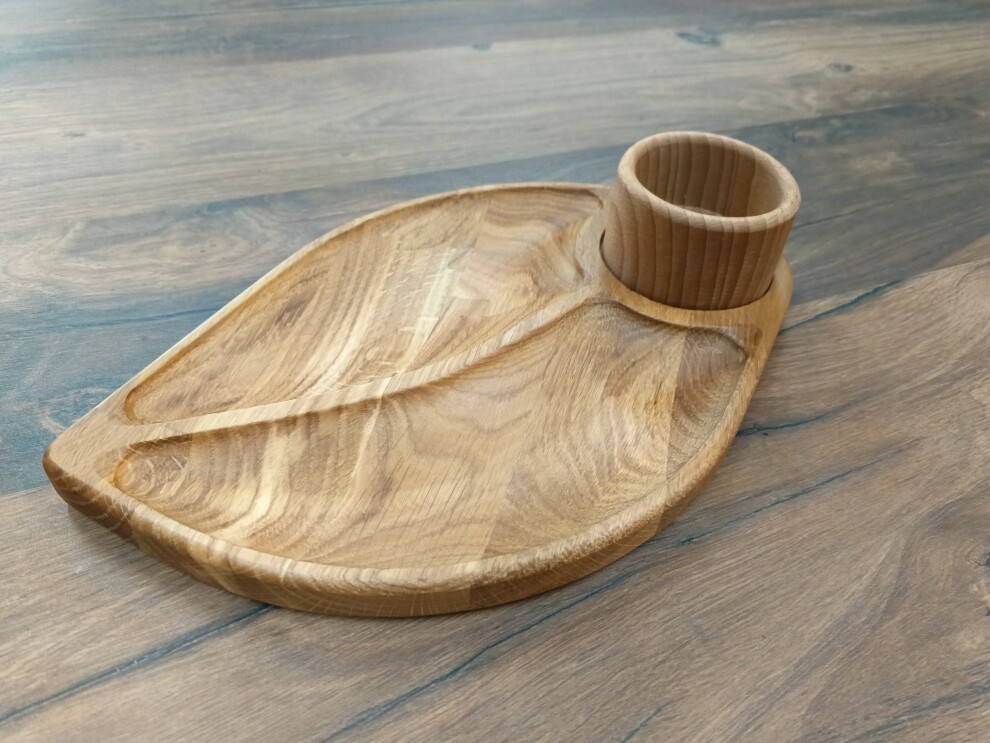 Менажница-поднос «Лист» из натурального дуба с соусником — стильная и прочная посуда для элегантной подачи фруктов, сыра, орехов, закусок и десертов.