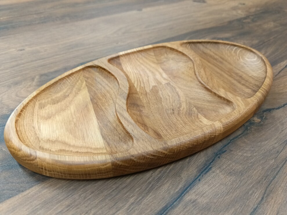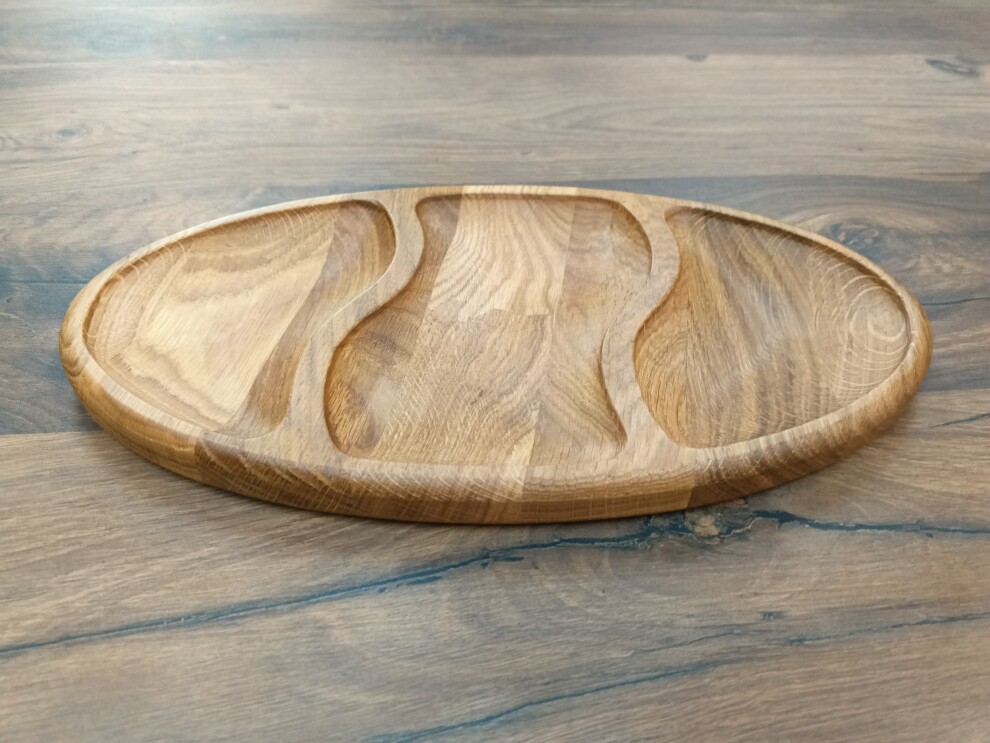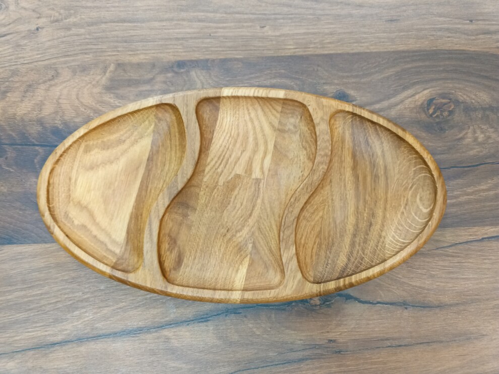 Менажница «Волна» из натурального дуба с тремя глубокими секциями (16 х 30 см, толщина 2 см) — удобное и стильное решение для подачи фруктов, овощей, орехов, сыра и десертов.