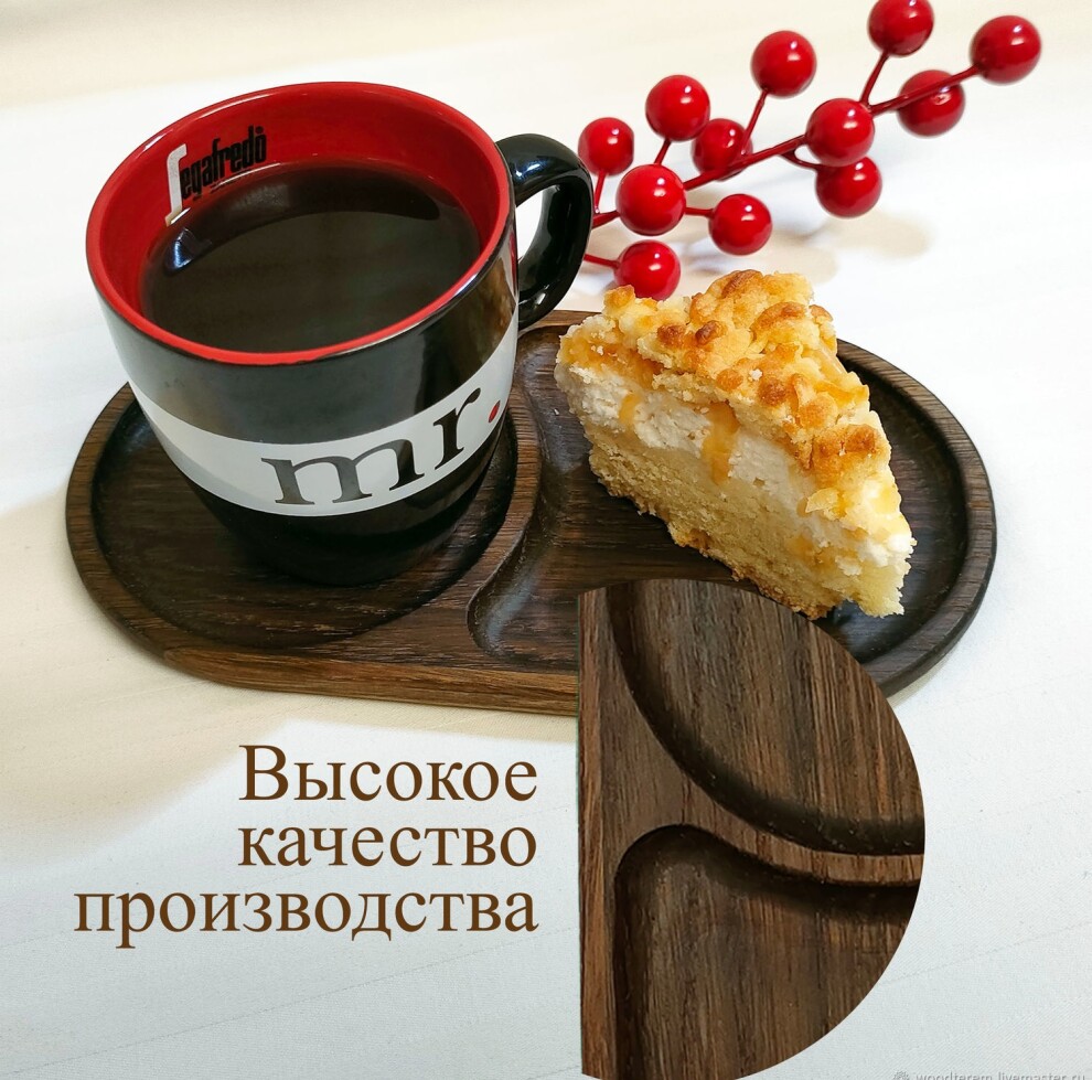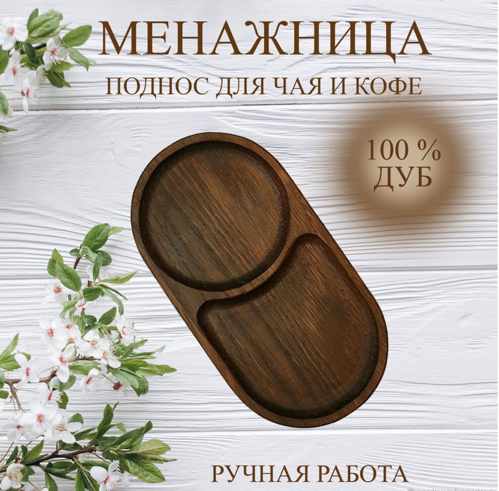 Этот поднос идеально подходит для сервировки чая и кофе. Подарите любимой на 8 марта! Декоративная менажница отлично подойдет для подачи сладостей и сервировки легких блюд. Деревянная тарелка изготовлена из экологического сырья и полностью безопасна для продуктов питания.